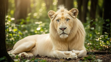 Majestic lion with a flowing mane is illuminated by the warm autumn light