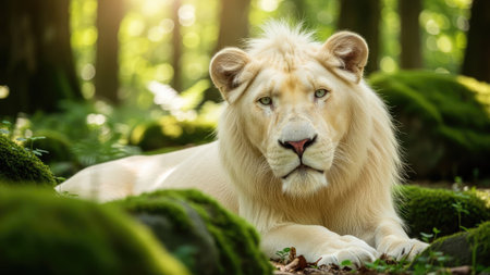 A lion and a sheep stand close together in a lush, green forest, gazing at each other in a surprising encounter amidst nature's tranquility.