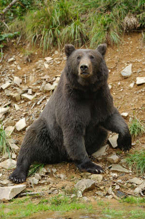 Brown bear is a wild and dangerous animal, rest after a walk, bears of Synevyr glade in the Carpathians, early spring in the national park.
