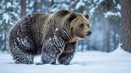 Brown bear in the winter forest. Scientific name: Ursus arctos.