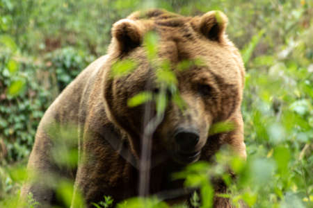 Wild adult Brown Bear Ursus Arctos in the summer forest.