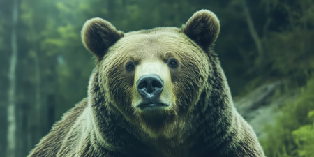 Portrait of a majestic face of a bear on the background of a forest. Generative AI
