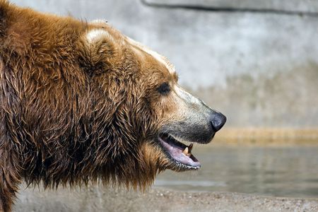 Brown bear drinking water. Brown bear, Ursus arctos, sitting on the stone, near the water pond. Brow in the water. Big brown bear with water in the paw. Brown bear in the nature lake habitat.