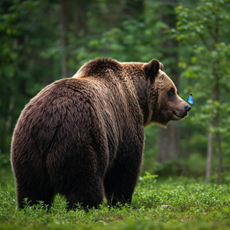 A majestic bear wanders through a lush green forest, surrounded by vibrant moss and towering trees, embodying the beauty of wildlife in its natural habitat.