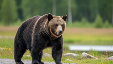 A large brown bear stands prominently in its natural outdoor habitat. The image displays the animal with its dark brown fur contrasting with lighter tones of its face. The composition includes blurred background elements suggesting a meadow and forest, lit with soft daylight suitable for various commercial uses.