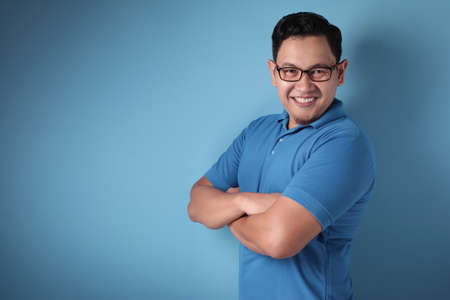 Portrait of funny young attractive cute Asian man smiling happily, with arms crossed, against blue background