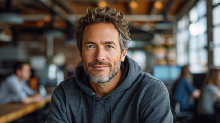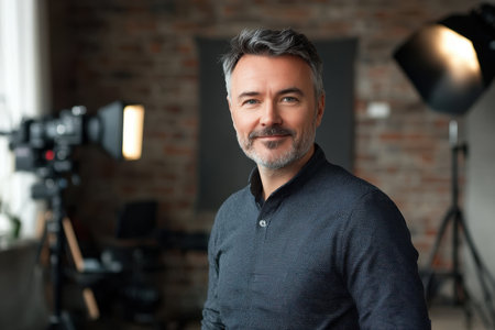 A confident man with gray hair stands in a modern studio room illuminated by soft lighting. He is dressed in a stylish sweater and exudes a warm, approachable demeanor, ready for the shoot.