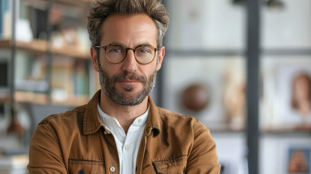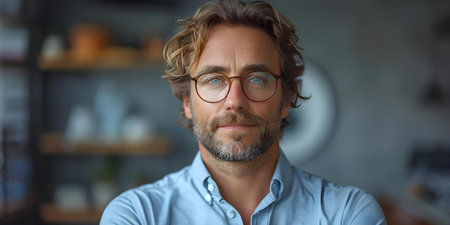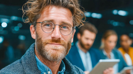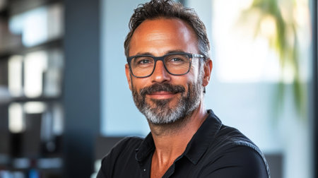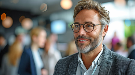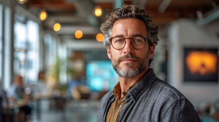 Confident middle-aged businessman with glasses smiling subtly in an office environment, team blurred in background.