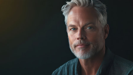 A mature man sits calmly with silver hair and a beard against a dark background displaying a thoughtful expression and natural charm.