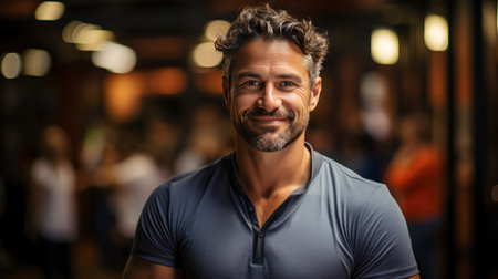 A confident man with a charming smile relaxes in a cozy interior with a warm ambiance, emphasizing calm and approachability.