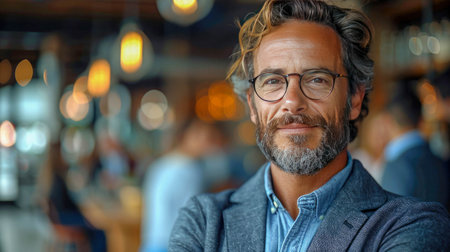 Confident man with glasses and beard in a casual outfit, standing in a cafe. Blurred background with warm lighting. Concept of confidence and style.