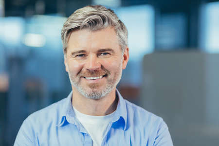 Close-up photo of male businessman, portrait of gray-haired experienced man looking at camera and smiling