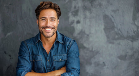 A confident young man in a casual denim jacket smiles warmly while crossing his arms against a neutral gray background. This image conveys warmth and approachability, perfect for lifestyle themes.