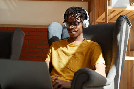 African man in wireless headphones sitting on armchair and working online on laptop computer