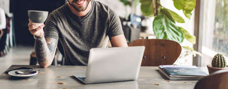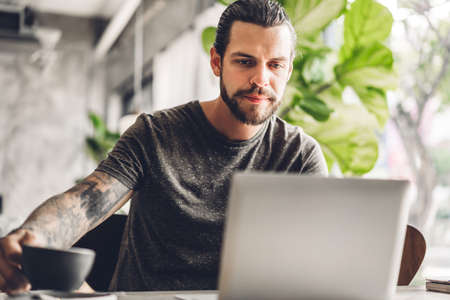 Handsome bearded hipster man use and looking at laptop computer with coffee at table in cafe.Communication and technology concept
