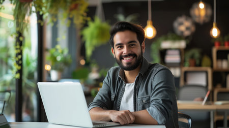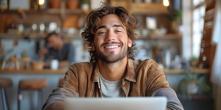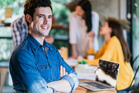 smart attractive caucasian man portrait with confident and happiness in cafe startup fouder ideas concept