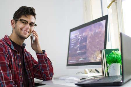 Portrait of a young man sitting at a table in the office and working on a computer. Co-working, business. Business and entrepreneurship concept