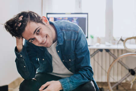 A cheerful young man with tousled hair beams at the camera, exuding confidence and warmth in a stylish office setting. His bright smile and relaxed demeanor create an inviting atmosphere, perfect for showcasing creativity and collaboration in a contemporary work environment.