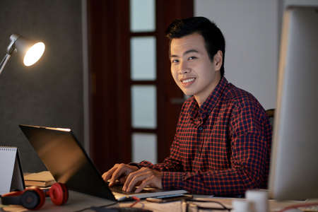 Smart asian businessman or male freelancer focused on his project, looking at notebook laptop screen, using laptop computer.