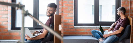A man sits on a windowsill in headphones with a laptop. Relaxation and listening to music. Online communication