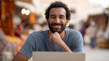 Happy digital nomad smiling while working remotely on a laptop in a bustling traditional market, embracing the freedom of a work and travel lifestyle filled with adventure and discovery