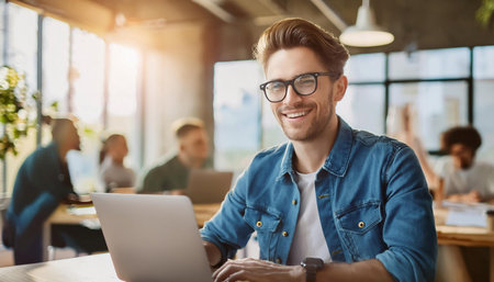 A young man is engaged in work on his laptop at a modern office, wearing glasses and a denim jacket. He smiles warmly while seated at a desk, with colleagues collaborating in the background. Sunlight filters through large windows, creating a bright and inviting atmosphere.