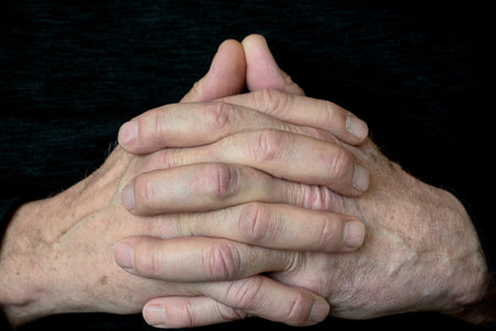 Black & white image of wrinkled male hands held out, clasped with fingers together, in thought or prayer, isolated against a black background with dramatic lighting.