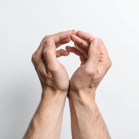 Two hands are positioned with fingers interlocked, forming a diamond shape, palms open, against a white background.