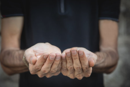 Male weary hands, palms up on a black isolated background. Concept of Hope and Support.