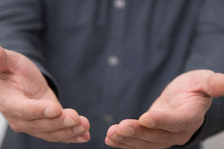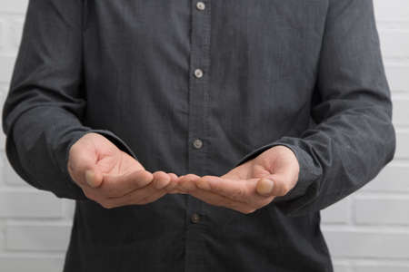 Mens hands hold or give something. Hand gesture. Fingers and palms