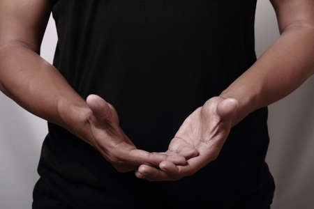Man holding his hands together thank you sign hand gesture high angle view on a white background