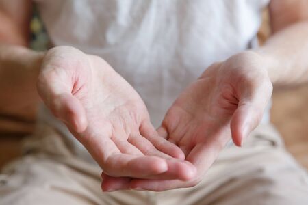 Two women's hands are folded in a boat asking for alms. Selective focus. Close-up