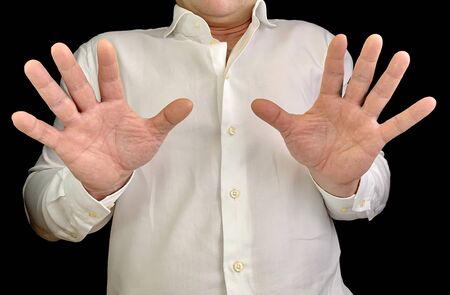A man holds two hands in front of him. A man in a white shirt shows a hand gesture, on a black background. Concept: fear, rejection, opposition.