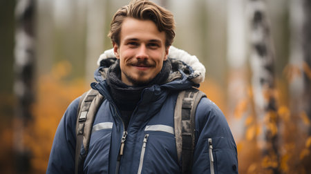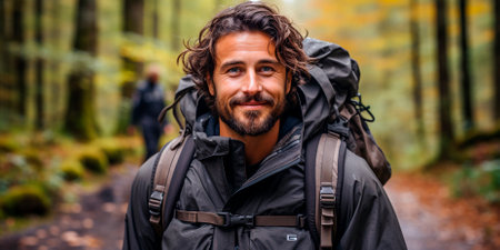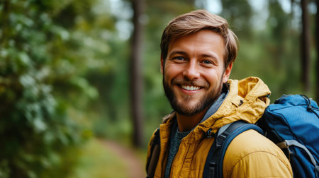 Portrait of smiling young caucasian man trekking in forest