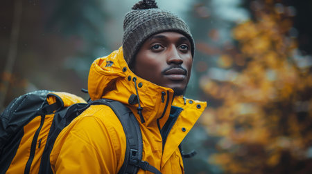 Handsome african american man in yellow jacket and hat looking away while standing in autumn forest