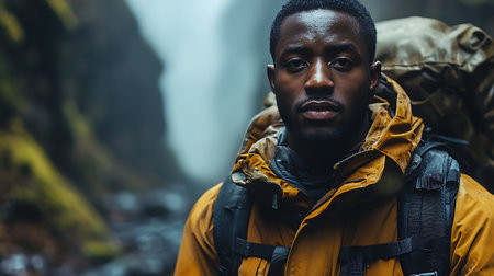 Portrait of a young african man looking at camera while hiking in the mountains
