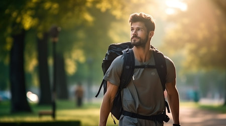 A man with a backpack enjoys nature while walking, embodying urban fitness and the trend of rucking for exercise.