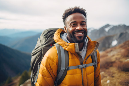 Smiling african american man with backpack wearing down jacket on the trail in mountains