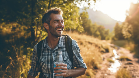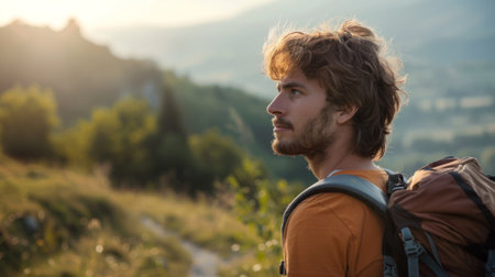A young man with a backpack enjoys a peaceful moment outdoors, smiling warmly as the sun sets behind scenic mountains and lush trees.