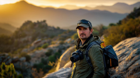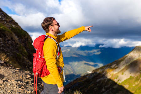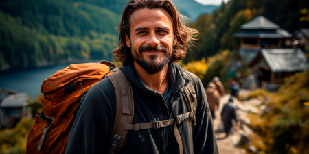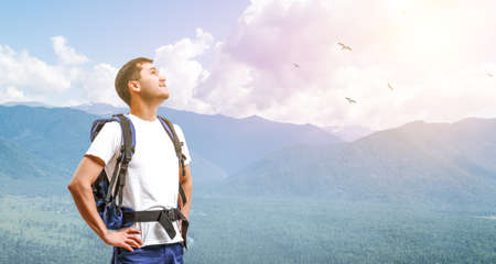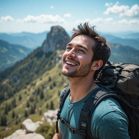 Experience the joy of traveling with our lucky man on a mountain adventure. The traveler enjoys the beauty and freedom of summer exploration. Feel the excitement of discovering new places