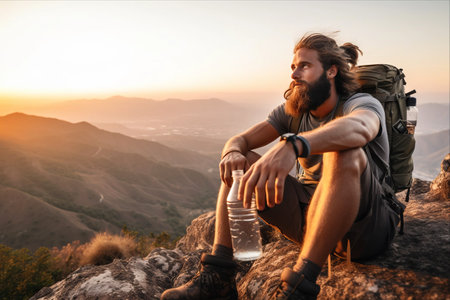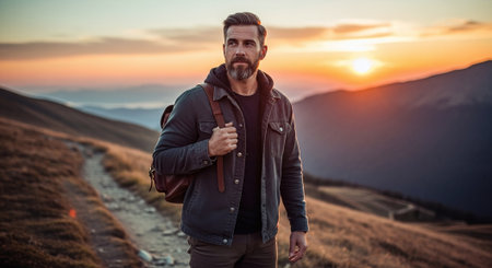 Bearded man with backpack on rugged mountain path at golden hour.