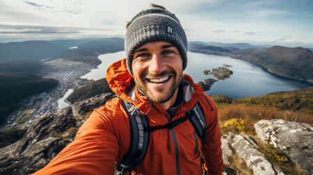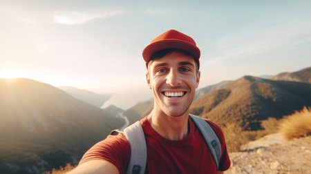 Generative AI : Handsome adventurous man taking selfie at mountain Caucasian young man smiling at the camera