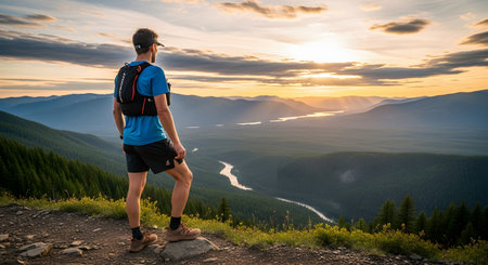 A male trail runner stands on a rocky mountain peak, admiring the breathtaking view of a river valley at sunset. He wears a hydration vest and running gear, symbolizing fitness and adventure in nature.