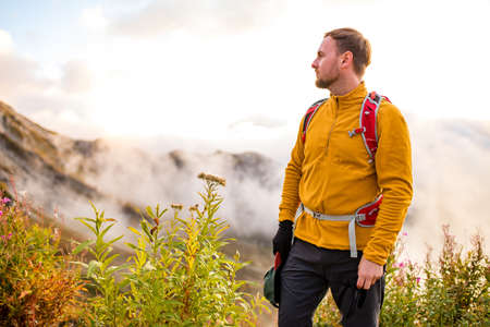 Handsome young man with backpack standing in the mountains at sunset