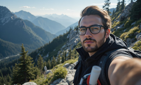 Handsome young man hiking in the mountains and taking a selfie