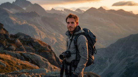 Young man with a backpack and camera standing on a mountain peak at sunrise