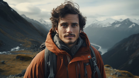 shot of a young man hiking in the mountains, created with generative ai
