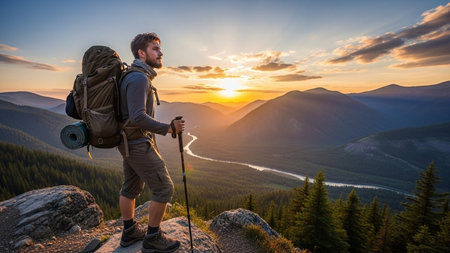 A young man with a backpack stands on a mountain trail with a scenic view of the sunset