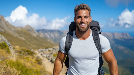 Portrait of a smiling hiker with backpack standing on a mountain trail