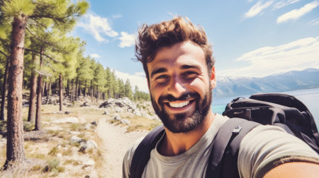 A man with a backpack taking selfie on trail, AI